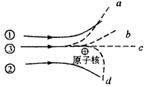 式结构。如图所示的平面示意图中,①、②两条实线表示α粒子运动的轨迹,则沿③所示方向射向原子核的α粒子可能的运动轨迹为虚线中的 ( )![]()