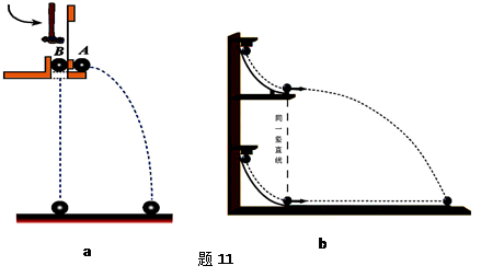 在研究平抛运动时,我们做了两点猜想①平抛的水平分运动是匀速直线运动;②平抛的竖直分运动是自由落体运动.为此,我们通过对比实验进行了探究,如图题11的a、b两个实验所示,则关于两实验下列说法正确的是:![]()