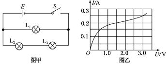 在如图甲所示的电路中,电源的电动势为3.0V,内阻不计,L1、L2、L3为3个用特殊材料制成的同规格的小灯泡,这种小灯泡的伏安特性曲线如图乙所示。当开关S闭合稳定后![]()