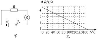 空调、电冰箱等家用电器中有一个很重要的温控元件,它就是热敏电阻,对应一个 热敏电阻值一定有一个和它电阻所处的环境对应的温度。如下图甲所示,电源的电动势E="12.0" V,内电阻r="1" kΩ,G为灵敏电流计,内阻Rg保持不变;R为热敏电阻,其电阻值与温度的变化关系如下图乙所示,闭合开关S,当R的温度等于20 ℃时,电 流表示数I1="2" mA;当电流表的示数I2=3.0mA时,热敏电阻的温度是![]()