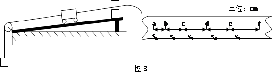 在探究“恒力做功与动能改变的关系”的实验中,某同学采用如下图3装置,小车质量M,在平衡摩擦力之后,挂上重物m后,小车拖动纸带并打出一系列的点。图中的纸带只是打出的纸带的一部分,所标注的点相邻两点的时间间隔为T。使用毫米刻度尺进行测量后,将数据记录在图中。则:(重力加速度为g)