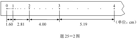 (2)题25—2图为某同学在实验中打出的一条纸带,计时器打点的时间间隔为0.02s。他从比较清晰的点起,每五个点取一个计数点,则相邻两计数点间的时间间隔为 s。为了由v-t图象求出小车的加速度,他量出相邻两计数点间的距离,分别求出打各计数点时小车的速度。其中打计数点3时小车的速度为 m/s。(保留两位有效数字)