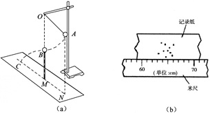 某研究性学习小组用如图(a)所示装置验证机械能守恒定律。让一个摆球由静止开始从A位置摆到B位置,若不考虑空气阻力,小球的机械能应该守恒,即,但直接测量摆球到达B点的速度v比较困难,现利用平抛的特性来间接地测出v。如图(a)中,悬点正下方一竖直立柱上 放置一个与摆球完全相同的小球(OB等于摆线长),当悬线摆至B处,摆球与小球发生完全弹性碰撞(速度互换),被碰小球由于惯性向前飞出作平抛运动。在地面上放上白纸,上面覆盖着复写纸,当小球落在复写纸上时,会在下面白纸上留下痕迹。用重锤线确定出A、B点的投影点N、M。重复实验10次(小球每一次都从同一点由静止释放),球的落点痕迹如图(b)所示,图中米尺水平放置,零刻度线与M点对齐。用米尺量出AN的高度h1、BM的高度h2,算出A、B两点的竖直距离,再量出M、C之间的距离x,即可验证机械能守恒定律。(已知重力加速度为g,两球的质量均为m。)(1)根据图(b)可以确定小球平抛时的水平射程为 m。(2)用题中所给字母表示出小球平抛时的初速度v0 = 。(3)此实验中,小球从A到B过程重力势能的减少量ΔEP = ,动能的增加量EK= 若要验证此过程中摆球的机械能守恒,实验数据应满足一个怎样的关系 。(用题中的符号表示)