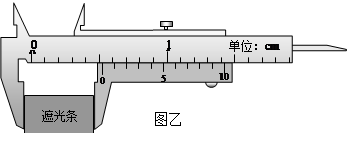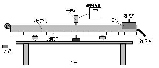 某实验小组利用如图甲所示的实验装置来验证钩码和滑块所组成的系统机械能守恒.(1)实验前需要调整气垫导轨底座使之水平,利用现有器材如何判断导轨是否水平? .(2)如图乙所示,用游标卡尺测得遮光条的宽度d= cm;实验时将滑块从图示位置由静止释放,由数字计时器读出遮光条通过光电门的时间Δt=1.2×10-2s,则滑块经过光电门时的瞬时速度为 m/s.在本次实验中还需要测量的物理量有:钩码的质量m、 和 (文字说明并用相应的字母表示).(3)本实验通过比较 和 在实验误差允许的范围内相等(用测量的物理量符号表示),从而验证了系统的机械能守恒.