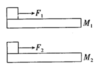 如图所示,在光滑的水平面上放着两块长度相等,质量分别为M1和M2的木板,在两木板的左端分别放有一个大小、形状、质量完全相同的物块。开始都处于静止状态,现分别对两物块施加水平恒力F1F2,当物块与木板分离后,两木板的速度分别为V1和V2。若已知v1>v2,且物块与木板之间的动摩擦因数相同,需要同时满足的条件是 ![]()