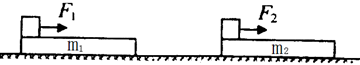 如图所示,在光滑水平面上,放着两块长度相同,质量分别为m1和m2的木板,在两木板的左端各放一个大小、形状、质量完全相同的物块,开始时,各物均静止.分别在两物块上 各作用一水平恒力F1、F2.当物块和木板分离时,两木板的速度分别为v1和v2.物块与木板间的动摩擦因数相同,下列说法正确的是( )![]()