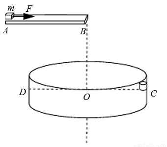 如图所示,在水平放置的圆盘边缘C点固定一个小桶,桶的高度不计,圆盘半径为R=1m,在圆盘直径CD的正上方,与CD平行放置一条水平滑道AB,滑道右端B与圆盘圆心O在同一竖直线上,且B点距离圆盘圆心的竖直高度h= 1.25m,在滑道左端静止放置质量为m=0.4kg的物块(可视为质点),物块与滑道的动摩擦因数为μ=0.2,现用力F=4 N的水平作用力拉动物块,同时圆盘从图示位置以角速度ω=2π rad/s,绕通过圆心O的竖直轴匀速转动,拉力作用在物块上一段时间后撤掉,最终物块由B点水平抛出,恰好落入圆盘边缘的小桶内。(重力加速度取10m/s2。)