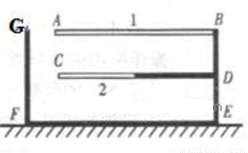 (9分)如图所示,“13”形状的各处连通且粗细相同的细玻璃管竖直放置在水平地面上,只有竖直玻璃管FG中的顶端G开口,并与大气相通,水银面刚好与顶端G平齐。AB = CD = L,BD = DE =,FG =。管内用水银封闭有两部分理想气体,气体1长度为L,气体2长度为L/2,L = 76cm。已知大气压强P0 = 76cmHg,环境温度始终为t0 = 27℃,现在仅对气体1缓慢加热,直到使BD管中的水银恰好降到D点,求此时(计算结果保留三位有效数字)