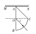 (9分)如图所示,为某种透明介质的截面图,△AOC为等腰直角三角形,BC为半径R=12 cm的四分之一圆弧,AB与水平屏幕MN垂直并接触于A点.一束红光射向圆心O,在AB分界面上的入射角i=45o,结果在水平屏幕MN上出现两个亮斑。已知该介质对红光的折射率为n=,求两个亮斑与A点间的距离。