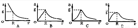 假设地球是一半径为R,质量分布均匀的球体。已知质量分布均匀的球壳对壳内物体引力为零,地球表面处引力加速度为g。则关于地球引力加速度a随地球球心到某点距离r的变化图像正确的是( )