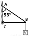 如图所示,位置固定的轻绳拉住轻杆的右端B点,轻绳与竖直墙壁间的夹角是53°。轻杆左端固定在铰链上,可以绕铰链转动。而铰链在墙壁上的安装位置可以任意选定,同时可以根据需要选用合适长度的轻杆,以使轻杆受到的压力最小。现将一个质量是100kg的重物挂在B点。g取10 m/s2,则轻杆承受的最小压力是: