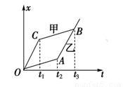 甲、乙两车某时刻由同一地点,沿同一方向开始做直线运动,若以该时刻作为计时起点,得到两车的位移—时间图象如图所示,图象中的OC段与AB平行,CB段与OA平行,则下列说法中正确的是( )