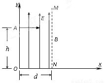 (12分)空间中取坐标系Oxy,在第一象限内平行于y轴的虚线MN与y轴距离为d,从y轴到MN之间的区域充满一个沿y轴正方向的匀强电场,电场强度大小为E,如图所示。初速可忽略的电子经过一个电场直线加速后,从y轴上的A点以平行于x轴的方向射入第一象限区域,A点坐标为(0,h)。已知电子带电量大小,质量,忽略电子重力的作用。则