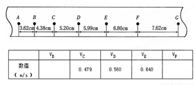 ①试根据纸袋上各个计数点间的距离,计算出打下B、C、D、E、F五个点时小车的瞬时速度,并将各个速度值填入下表(要求保留3位有效数字)