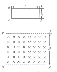 如图所示,水平地面上方有一高度为H、上、下水平界面分别为PQ、MN的匀强磁场,磁感应强度为B。矩形导线框ab边长为l1,bc边长为l2,导线框的质量为m,电阻为R。磁场方向垂直于线框平面向里,磁场高度H> l2。线框从某高处由静止落下,当线框的cd边刚进入磁场时,线框的加速度方向向下、大小为;当线框的cd边刚离开磁场时,线框的加速度方向向上、大小为。在运动过程中,线框平面位于竖直平面内,上、下两边总平行于PQ。空气阻力不计,重力加速度为g。求: