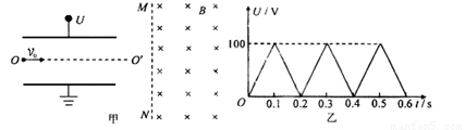 (20分)如图甲所示,两平行金属板长度l不超过0.2 m,两板间电压U随时间t变化的图象如图乙所示。在金属板右侧有一左边界为MN、右边无界的匀强磁场,磁感应强度B =0.01 T,方向垂直纸面向里。现有带正电的粒子连续不断地以速度v0=105m/s射入电场中,初速度方向沿两板间的中线OO’方向。磁场边界MN与中线OO’垂直。已知带电粒子的比荷q/m=108C/kg,粒子的重力和粒子之间的相互作用力均可忽略不计。