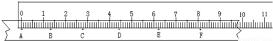 (2)某同学拖动纸带运动,打点计时器在纸带上打出一系列点,电源的频率是50Hz,处理时每隔1个点取一个记数点,标上字母A、B、C、D、E、F,A点与0刻度对齐.如图所示,某同学用mm刻度尺进行测量,请帮忙读出B、C在刻度尺上的位置,填到下表中: