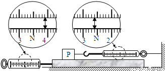 如图所示,把一个弹簧测力计的一端固定在墙上,用另一个弹簧测力计水平向左拉金属板,金属板向左运动,此时两个测力计的示数稳定(图中已把弹簧测力计的示数放大画出),则物块P与金属板间的滑动摩擦力的大小是 N.(精确到0.01N)若用弹簧测力计测得物块P重13N,根据表中给出的动摩擦因数,可推算出物块P的材料为 .