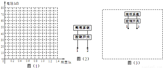 (2)如图(2)所示,当1、2两端所加电压上升至2V时,控制开关自动启动照明系统.请利用下列器材设计一个简单电路,给1、2两端提供电压,要求当天色渐暗,照度降低至1.0(1x)时启动照明系统,在图(3)虚线框内完成电路原理图(不考虑控制开关对所设计电路的影响),提供的器材如下: