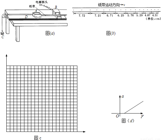 某同学设计了一个探究加速度与物体所受合力F及质量m间关系的卖验.图(a)为实验装置简图,A为小车,B为打点计时器,C为装有砂的砂桶,D为一端带有定滑轮的长方形木板,实验中认为细绳对小车拉力F等于砂和砂桶总重力,小车运动加速度a可由纸带上点求得.