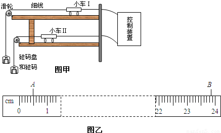 在“探究加速度与物体质量、物体受力的关系”活动中,某小组设计了如图甲所示的实验装置.图中上下两层水平轨道表面光滑,两小车前端系上细线,细线跨过滑轮并挂上砝码盘,两小车尾部细线连到控制装置上,实验时通过控制装置使两小车同时开始运动,然后同时停止.
