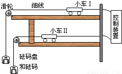 在“探究加速度与物体质量、物体受力的关系”活动中,某小组设计了如图所示的实验装置.图中上下两层水平轨道表面光滑,两小车前端系上细线,细线跨过滑轮并挂上砝码盘,将砝码和砝码盘的总重作为小车所受合外力,两小车尾部细线连到控制装置上,实验时通过控制装置使两小车同时开始运动,并同时停止.