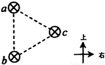 在等边三角形的三个顶点a、b、c处,各有一条长直导线垂直穿过纸面,导线中通有大小相等的恒定电流,方向如图.过c点的导线所受安培力的方向( )