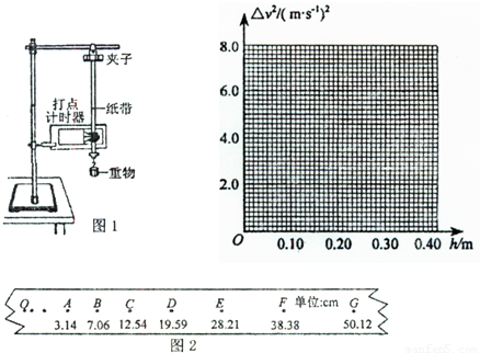 (1)图2是实验中打下的一条纸带,O点是重物开始下落时打下的起点,该小组在纸带上选取A、B、C、D、E、F、G七个计数点,每两个计数点间还有一个计时点(图中未画出),各计数点与起点O的距离如图所示,已知打点计时器工作频率为50Hz,分别计算B、C、D、E、F五个计数点与O点的速度平方差