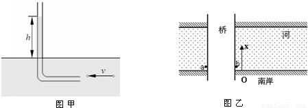 某研究性学习小组发现河水在缓慢流动时有一个规律,河中央流速最大,岸边速度几乎为零.为了研究河水流速与从岸边到中央距离的关系,小明同学设计了这样的测量仪器:如图甲所示,两端开口的“L”型玻璃管的水平部分置于待测的水流中,竖直部分露出水面,且露出水面部分的玻璃管足够长.当水流以速度 v 正对“L”型玻璃管的水平部分开口端匀速流动时,管内外液面的高度差为 h,且h 随水流速度的增大而增大.为了进一步研究水流速度v 与管内外水面高度差h的关系,该组同学进行了定量研究,得到了如下的实验数据,并根据实验数据得到了v-h 图象,如图丙所示.