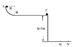 如图所示:半径为R=1.8m 的光滑圆轨道竖直固定在高h=5m 的水平台上,平台BC 长s=4.5m,一质量为mb=1kg 的小球b 静止在C 点。现让一质量为ma=2kg 的小球a 从A 点(与圆心等高)静止释放,运动到C 点与b 球发生碰撞,碰撞后a 球的速度水平向右,a、b 分别落在水平面上的M、N 两点,M、N 两点与平台的水平距离分别为xa=3m、xb=4m。两球可视为质点,g=10m/s2。求: