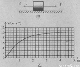 如题18图甲所示,足够大的水平面上静置一质量m=lkg的物体,若物体一旦运动就会受到一个阻碍物体运动的阻力f,且f=kV(k=lkg/s),现在给物体施加一个水平向右的恒定拉力F,并每隔0.2s测量一次物体的速度,乙图是根据所测数据描绘出物体的V—t图像。求: