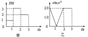 一滑块在水平地面上沿直线滑行,t=0时其速度为2.0m/s。从此刻开始在滑块运动方向上再施加一水平拉力F,力F和滑块的速度v随时间t的变化规律分别如图甲和乙所示。设在第1s内、第2s内、第3s内力F对滑块做功的平均功率分别为P1、P2、P3,则下列说法正确的是 ( )