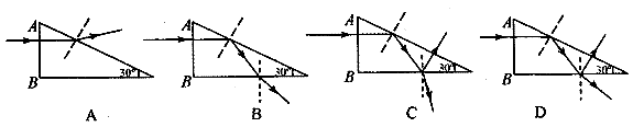 如图所示,一束光从空气垂直射到直角棱镜的AB面上,已知棱镜材料的折射率为1.4,则这束光进入棱镜后的光路图应为下面四个图中的 ( )