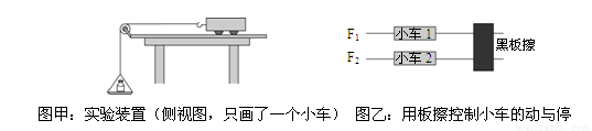两个相同的小车放在光滑水平板上,前端各系一条细绳,绳的另一端跨过定滑轮各挂一个小盘,盘中可放砝码(如图甲所示)。小盘和砝码所受的重力,等于使小车做匀加速运动的力。因此增减小盘中的砝码就可以改变小车的受到的合力。两个小车后端各系一条细线,用一个黑板擦把两条细线同时按在桌上,使小车静止(如图乙所示)。抬起黑板擦,两个小车同时运动,按下黑板擦两个小车同时停下来。若小车1和小车2所受拉力分别为F1、F2,车分别为m1、m2,抬起再按下黑板擦则得两车的位移分别x1、x2,则在实验误差允许的范围内,有
