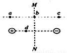 如图所示,在两等量异种点电荷的电场中,MN为两电荷连线的中垂线,a、b、c三点所在直线平行于两电荷的连线,且a与c关于MN对称,b点位于MN上,d点位于两电荷的连线上。以下判断正确的是