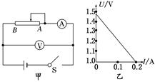 (10分)为了测量一节干电池的电动势和内阻,某实验小组按图甲所示的电路图连好实验电路,合上开关,电流表和电压表的读数正常,当将滑动变阻器的滑片由A端向B端逐渐滑动时,发现电流表的示数逐渐增大,而电压表的示数接近1.5 V且几乎不变,直到当滑片滑至临近B端时电压表的示数急剧变化,这种情况很难读出电压数值分布均匀的几组不同的电流值、电压值,出现上述情况的原因是________________.改进方法是_______________.改进后,测出几组电流、电压的数值,并画出如图乙所示的图象,由图象可知,这个电池的电动势为E=________V,内阻r=________ Ω.