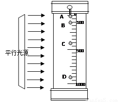 某科技馆中有一个展品,该展品放在较暗处。有一个不断均匀滴水的龙头(刚滴出的水滴速度为零)在平行光源的照射下,可以观察到一种奇特的现象:只要耐心地缓慢调节水滴下落的时间间隔,在适当的情况下,看到的水滴好象都静止在各自固定的位置不动(如图中A、B、C、D所示,右边数值的单位是 mm)。要想出现这一现象,所用光源应为频闪光源,滴水时间间隔必为 s。(请保留两位有效数字)