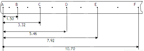(3分)某同学在研究小车运动实验中,获得一条点迹清楚的纸带,已知打点计时器每隔0.02秒打一个计时点,该同学选择ABCDEF六个计数点,对计数点进行测量的结果记录在图中, 单位是cm。(1)试计算在打下B时小车的瞬时速度=_ ___ m/s;CE间的平均速度=__ ___m/s ; (2)计算小车的加速度=___ _____m/s2
