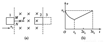 如图(a)所示,在光滑水平面上用恒力F拉质量为m的单匝均匀正方形铜线框,线框边长为a,在1位置以速度v0进入磁感应强度为B的匀强磁场并开始计时,若磁场的宽度为b(b>3a),在3t0时刻线框到达2位置,速度又为v0,并开始离开匀强磁场.此过程中vt图象如图(b)所示,则( )
