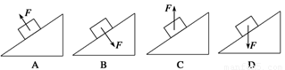 物块静止在固定的斜面上,分别按图示的方向对物块施加大小相等的力F,A中F垂直于斜面向上,B中F垂直于斜面向下,C中F竖直向上,D中F竖直向下.施力后物块仍然静止,则物块所受的静摩擦力不变的是: ( )