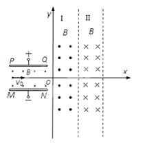 (19分)如图所示,带电平行金属板PQ和MN之间的距离为d;两金属板之间有垂直纸面向里的匀强磁场,磁感应强度大小为B。如图建立坐标系,x轴平行于金属板,与金属板中心线重合,y轴垂直于金属板。区域I的左边界在y轴,右边界与区域II的左边界重合,且与y轴平行;区域II的左、右边界平行。在区域I和区域II内分别存在匀强磁场,磁感应强度大小均为B,区域I内的磁场垂直于Oxy平面向外,区域II内的磁场垂直于Oxy平面向里。一电子沿着x轴正向以速度v0射入平行板之间,在平行板间恰好沿着x轴正向做直线运动,并先后通过区域I和II。已知电子电量为e,质量为m,区域I和区域II沿x轴方向宽度均为