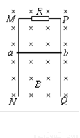如图所示,足够长的光滑平行金属导轨MN、PQ竖直放置,一个磁感应强度B=0.50T的匀强磁场垂直穿过导轨平面,导轨的上端M与P间连接阻值为R=0.30Ω的电阻,导轨宽度L=0.40m。电阻为r=0.20Ω的金属棒ab紧贴在导轨上,导轨电阻不计,现使金属棒ab由静止开始下滑,通过传感器记录金属棒ab下滑的距离,其下滑距离与时间的关系如下表所示。(g=10m/s2)