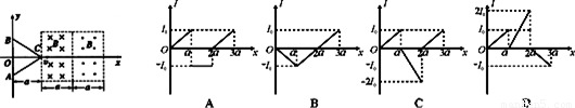 如图所示,两个垂直纸面的匀强磁场方向相反。磁感应强度的大小均为B,磁场区域的宽度为a,一正三角形(高度为a)导线框ABC从图示位置沿图示方向匀速穿过两磁场区域,以逆时针方向为电流的正方向,在下图中感应电流I与线框移动距离x的关系图的是( )