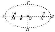 如图所示,虚线AB和CD分别为椭圆的长轴和短轴,相交于O点,两个等量异种点电荷分别固定在椭圆的两个焦点M、N上,A、E两点关于M点对称。下列说法正确的是( )