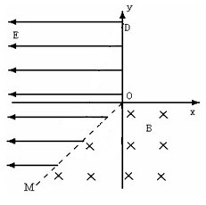如图所示,在xoy平面内,第Ⅲ象限内的直线OM是电场与磁场的边界,OM与负14x轴成45°角.在x<0且OM的左侧空间存在着负x方向的匀强电场E,场强大小为0.32N/C; 在y<0且OM的右侧空间存在着垂直纸面向里的匀强磁场B,磁感应强度大小为0.1T.一不计重力的带负电的微粒,从坐标原点O沿y轴负方向以v0=2×103m/s的初速度进入磁场,最终离开电磁场区域.已知微粒的电荷量q=5×10-18C,质量m=1×10-24kg,求: