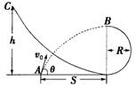 如图所示,曲面与半径为R=2.5m的竖直半圆组成光滑轨道.一个小球从A点斜向上抛,并在半圆最高点B水平进入轨道,然后沿曲面上升,最大高度达到h=10m。求小球抛出的速度和位置s.