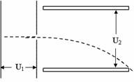 如图所示,有一质子(电量为e,质量为m)由静止经电压U1加速后,进入两块间距为d电压为U2的平行金属板间,若质子从两板正中间垂直电场方向射入,且正好能从下板右边缘穿出电场,求