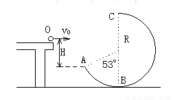 如图所示,将一质量为m=0.1Kg 的小球自水平平台右端O点以初速度v0水平抛出,小球飞离平台后由A点沿切线落入竖直光滑圆轨道ABC,到达轨道最高点C时,小球的速度为10m/s,圆轨道ABC的形状为半径为R=2.5m的圆截去了左上角的127°的圆弧,CB为其竖直直径,sin37°=0.6,g=10m/s2,
