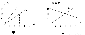 有四个运动的物体A、B、C、D,物体A、B运动的s-t图象如图中甲所示;物体C、D从同一地点沿同一方向运动的v-t图象如图1中乙所示。根据图象做出的判断正确的是( )