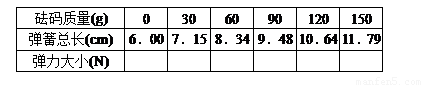 (8分)某同学在做探究弹力和弹簧伸长的关系的实验中,设计了如图所示的实验装置。所用的钩码每只的质量都是30g,他先测出不挂钩码时弹簧的自然长度,再将5个钩码逐个挂在弹簧的下端,每次都测出相应的弹簧总长度,将数据填在了下面的表中。